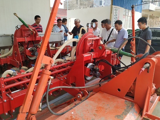 专家组一行4人冒着酷暑高温,先后到潜江、沙洋、钟祥、天门、仙桃等5个县市,实地察看大豆机械化种植情况,观察机械化播种的大豆生长情况,与当地农艺农机部门人员交流,了解当地大豆种植模式和种植习惯。在调研的每个县,专家们都深入农机合作社,调查大豆机械化种植机具,并提出一些技术改进意见。